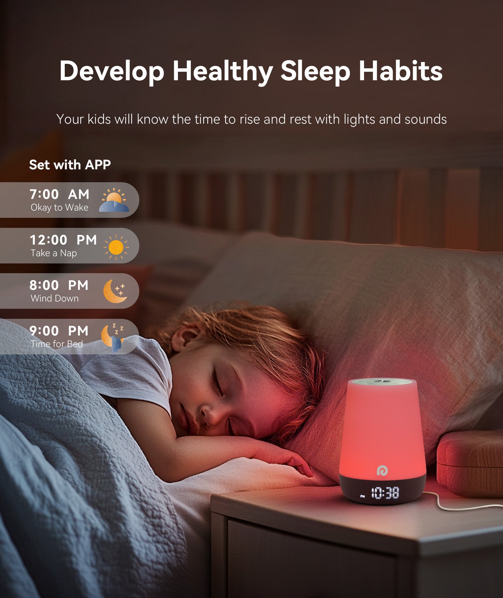 - 𝗘𝗳𝗳𝗲𝗰𝘁𝗶𝘃𝗲𝗹𝘆 𝗕𝘂𝗶𝗹𝗱 𝗛𝗲𝗮𝗹𝘁𝗵𝘆 𝗦𝗹𝗲𝗲𝗽 𝗛𝗮𝗯𝗶𝘁𝘀: Dreamegg Nite 1 sound machine combines light and music to send kids signals for sleep and waking up. By customizing different routines and alarms, it helps children understand when to sleep and when to get up, effectively aiding in building healthy sleep habits for kids. This will ease parents’ concerns and free up more of their time for personal pursuits.