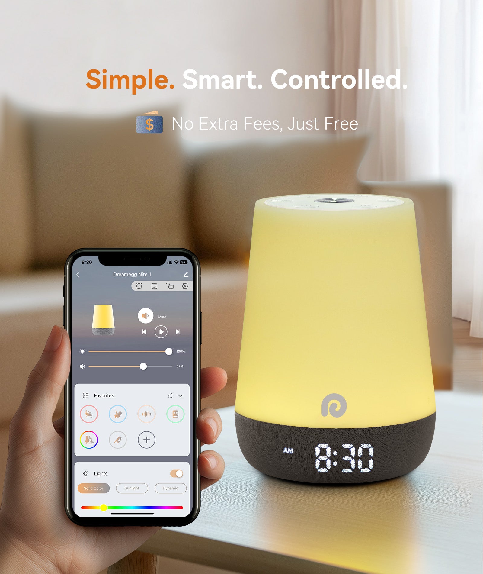- 𝗘𝗳𝗳𝗼𝗿𝘁𝗹𝗲𝘀𝘀 𝗔𝗽𝗽 𝗖𝗼𝗻𝘁𝗿𝗼𝗹: Dreamegg Nite 1 sound machine alarm clock for kids operates through a simple app interface. Easily connect to the product via the app to customize sleep routines, okay to wake clocks, night light modes, timers, child lock, and display brightness. Even when you’re not in your child’s room, you can remotely manage the device to ensure your little one sticks to a regular sleep routine.